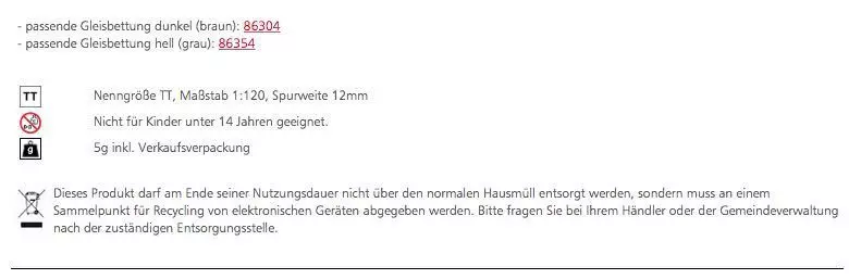 Eigenschaften "Tillig 83107 - Gleisstück gebogen R22 R353 mm / 15° TT 1:120"