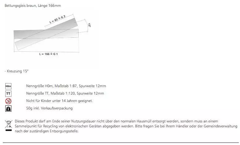 Eigenschaften "Tillig 83761 - Bettungsgleis-Kreuzung 15° 166 mm braun TT 1:120"