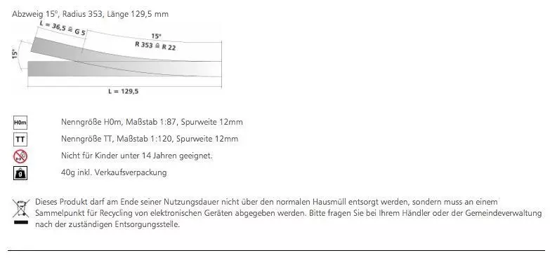 Eigenschaften "Tillig 83816 - Bettungsgleis-Weiche 15° rechts Hand TT 1:120"