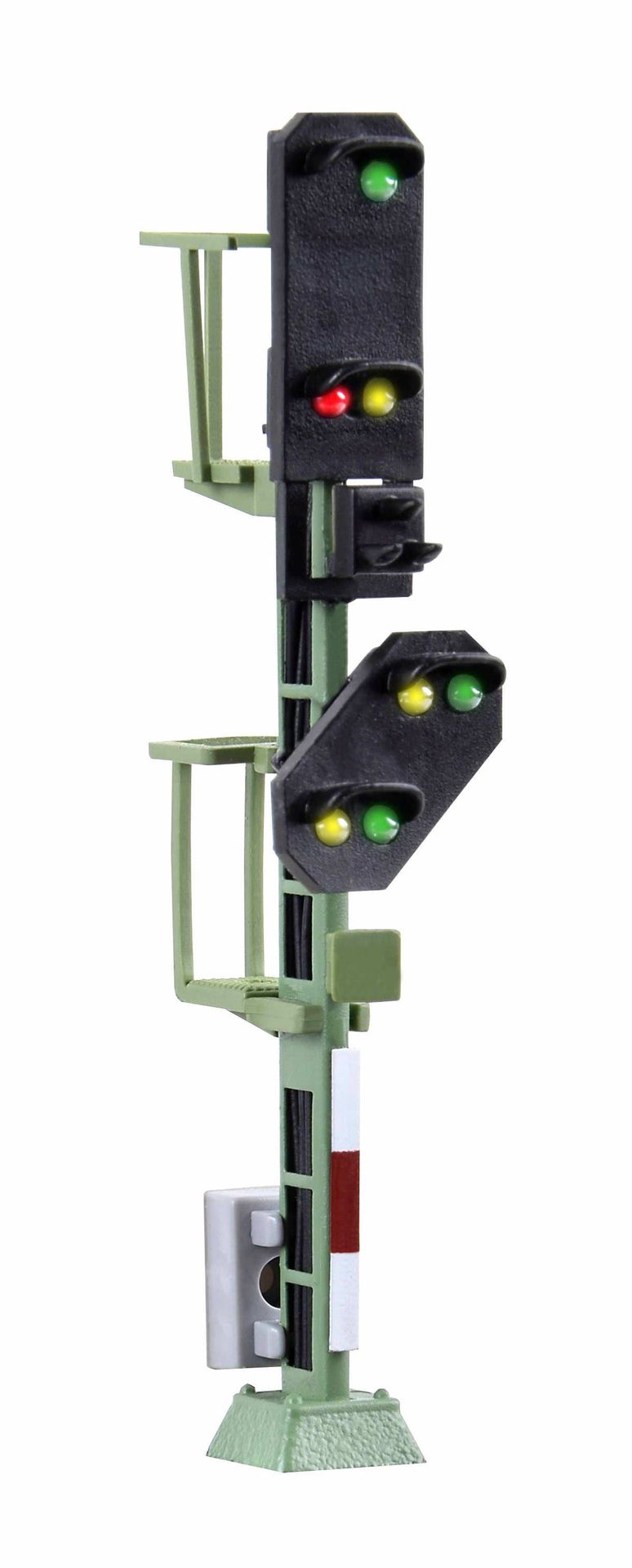 Signal der Einheitsbauart. Filigraner Messingmast in originalgetreuer Lackierung. Patentsteckfuß für einfache Montage. Mit 7 LEDs, wartungsfrei. Signalbilder Hp0, Hp1, Hp2, Vr0, Vr1 und Vr2. Passende Steuermodule: Art. 5220 und 5222. Höhe: 6,1 cm.