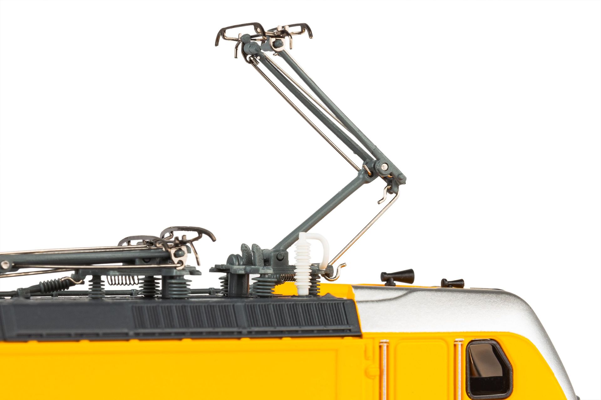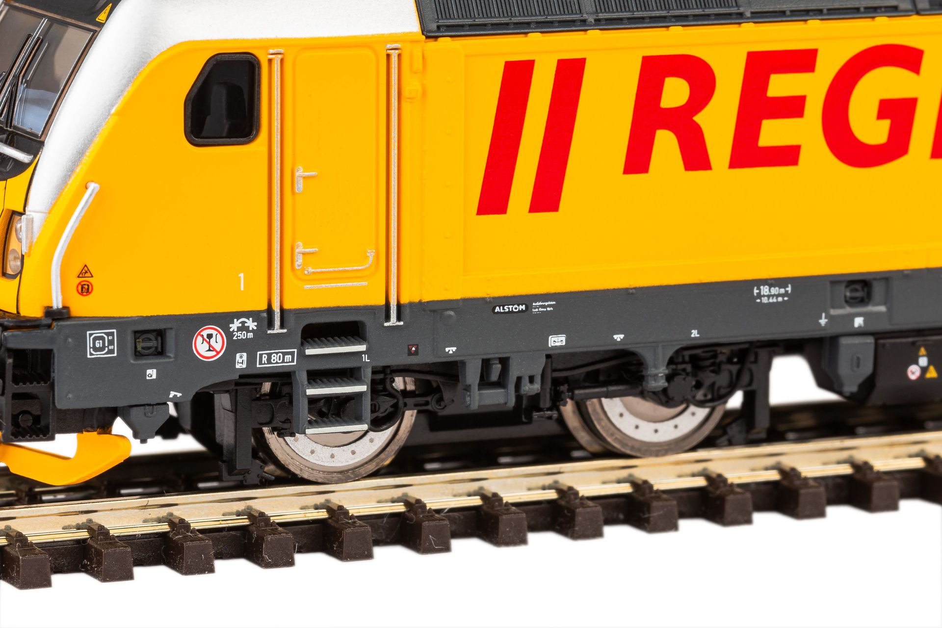 Neuheit 2024: Elektrolokomotive BR 147/ BR 187 in der Ausführung als BR 388 Regiojet in Epoche VI. Die PIKO Modelle der Baureihe 187 / 147 berücksichtigen die Unterschiede zwischen den beiden Baureihen, darunter die veränderte Kopfform und die Zugzielanzeige bei der Reisezugvariante. Der solide Motor sorgt mit einer präzise ausgewuchteten Schwungmasse für ausgezeichnete Laufeigenschaften. Die Zugkraft der über alle vier Achsen angetriebenen Lok wird über zwei Haftreifen verstärkt, die in diagonaler Anordnung auf den innen laufenden Achsen beider Drehgestelle sitzen. Befahrbar sind Radien ab 310 mm. Die Beleuchtung der Stirn bzw. Schlusslampen erfolgt über LEDs, deren Rot bzw. Weiß mit der Fahrtrichtung wechselt, wobei das rote „Schlusslicht“ digital schaltbar ist. Mit ihrer PluX22Schnittstelle sind die Modelle für Digitalbetrieb und Sounddecoder vorbereitet. Das Modell verfügt über TT Kurzkupplungen!
