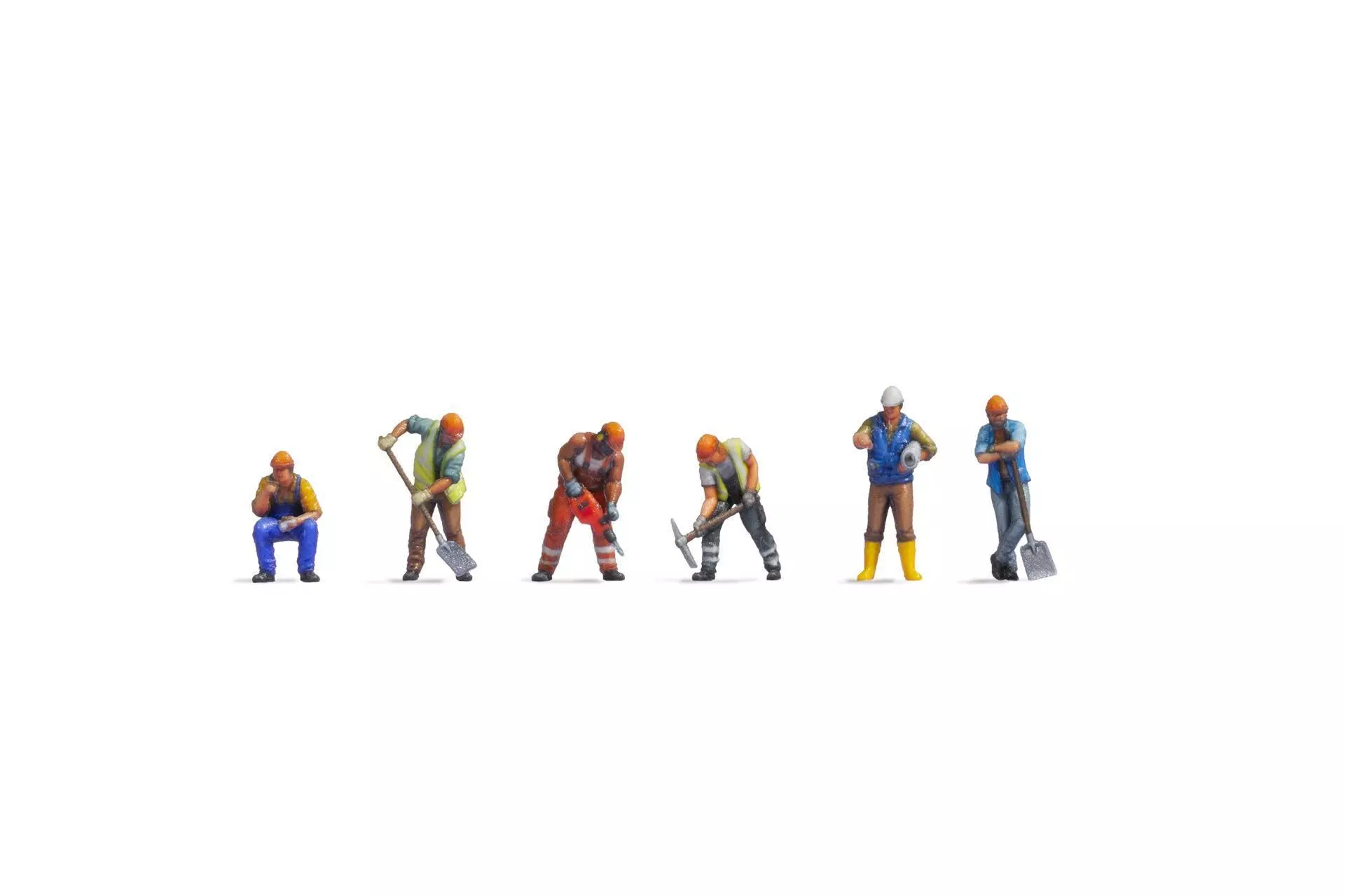 Das Set enthält sechs 3D gedruckte Figuren aus Kunststoff. Die Modelle der Bauarbeiter führen unterschiedliche Tätigkeiten aus: Ein Mann arbeitet mit der Spitzhacke, ein Kollege mit Laltzhose und Helm arbeitet mit einem Presslufthammer. Der Bauleiter hält die Baubläne unter dem Arm und gibt seinen Mitarbeitern Arbeitsaufträge. Ein Bauarbeiter steht auf seine Schaufeln gelehnt da.