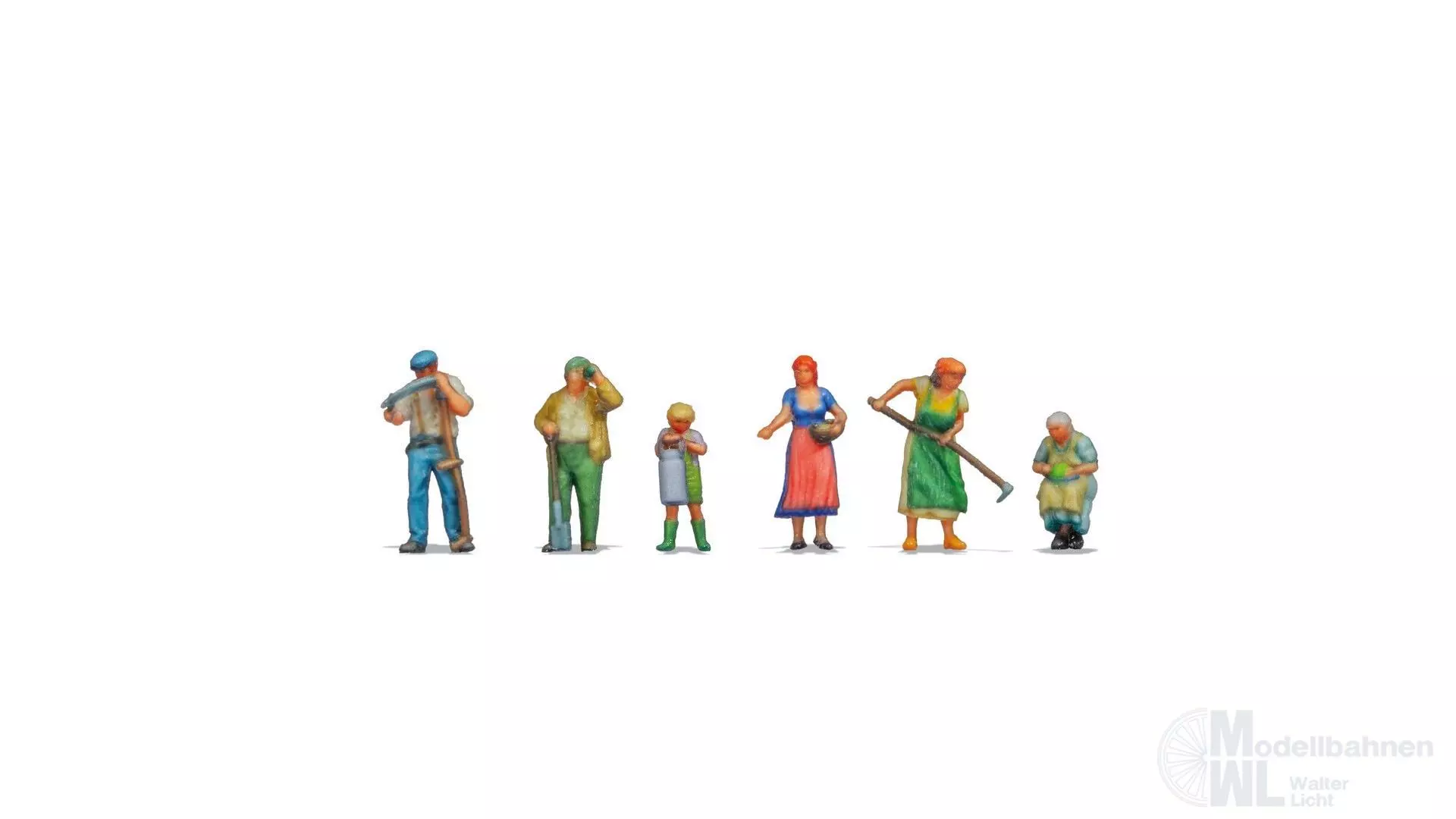 Eine Frau im traditionellen Dirndl trägt einen Korb in der Hand und füttert die Gänse. Die ältere Bäuerin sitzt auf einer Bank und schält einen Kohl. Eine weitere Frau, die einen beigen Rock und eine grüne Schürze trägt, bearbeitet mit einem Beil den Acker. Der ältere Landwirt hat einen Spaten in der Hand und genießt mit der anderen sein Feierabendbier. Ein dritter Landwirt schäft gerade seine Sichel, während ein kleiner Junge eine Milchkanne trägt.