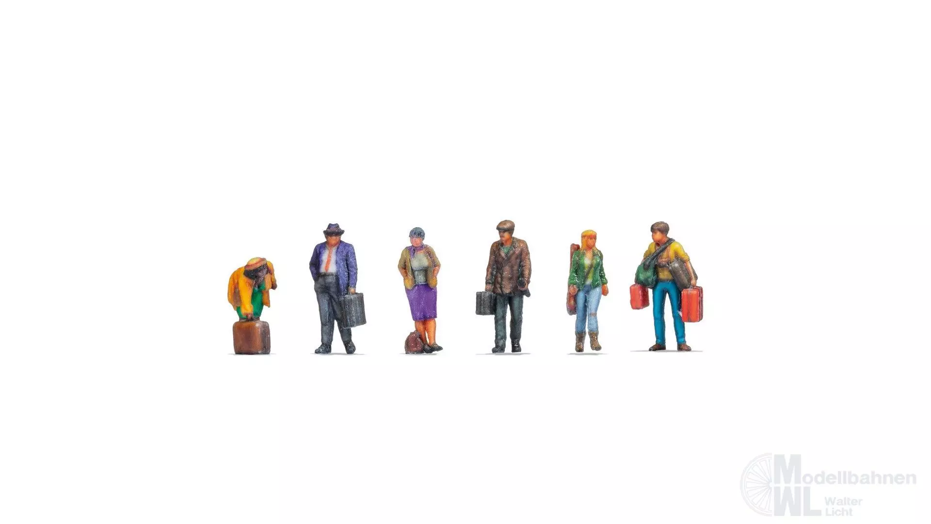 Eine ältere Dame im grün-gelben Mantel mit leichtem Gepäck, eine Geschäftsfrau im blau-weißen Kostüm mit lilafarbenem Koffer und Handtasche und eine sportlich gekleidete Dame mit grünem Blazer und Aktentasche. Drei der Reisenden sind Männer: Ein Mann mit Koffer im grauen Mantel, ein Geschäftsmann mit blauem Blazer und Aktenkoffer und ein Geschäftsmann im dunkelblauen Anzug mit Mantel und Aktentasche. Mit diesem Figurenset lassen sich Bahnhofs- und Bahnsteigszenen auf Modellbahnanlagen perfekt gestalten.