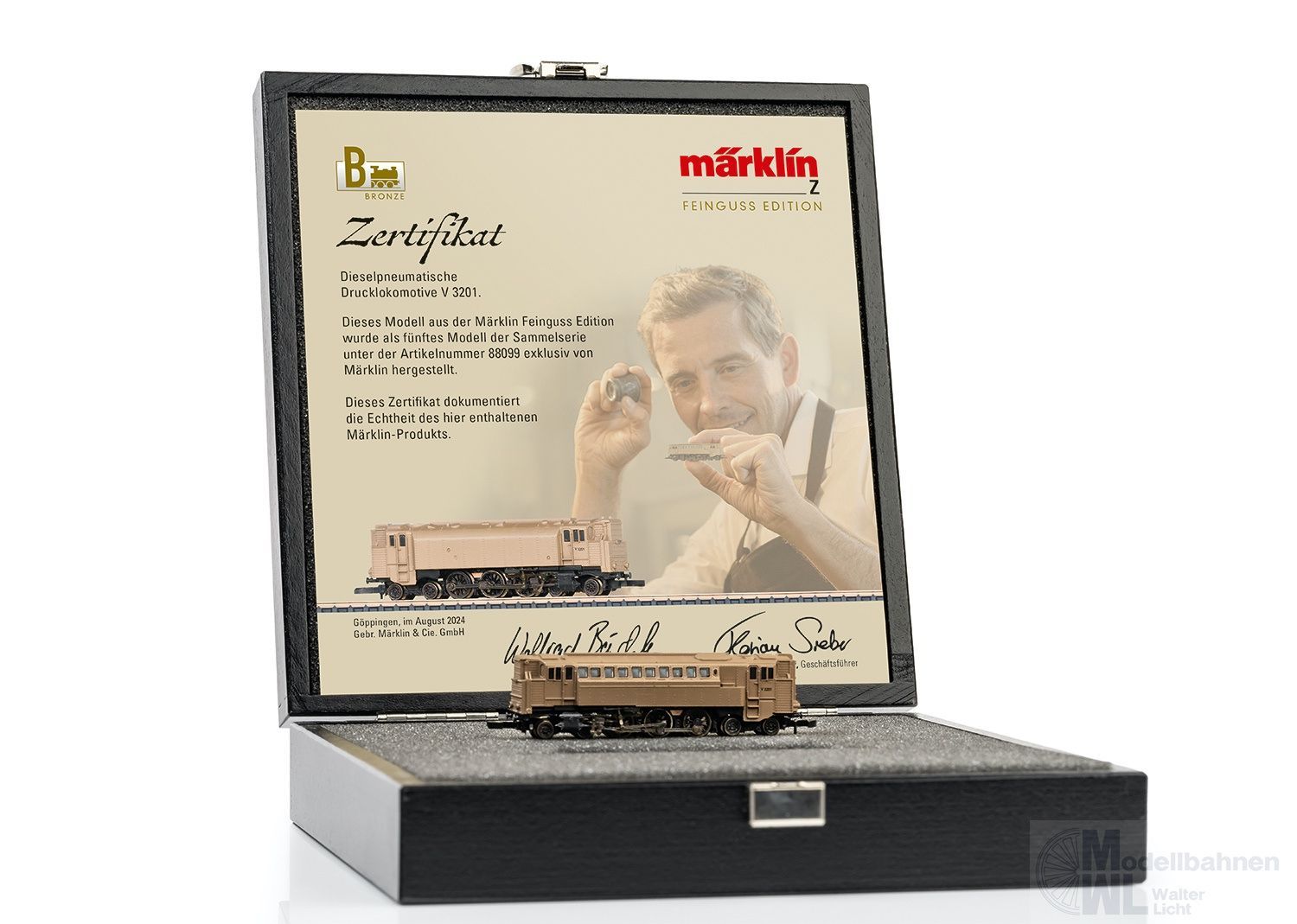 Modell aus der Märklin Z Feinguss Edition.Einmalige Fertigung des Modells, mit Lokgehäuse aus Bronze fein gegossen.Glockenankermotor.LED-Beleuchtung im Wechsel der Fahrtrichtung.Edle Holzverpackung.Echtheitszertifikat.