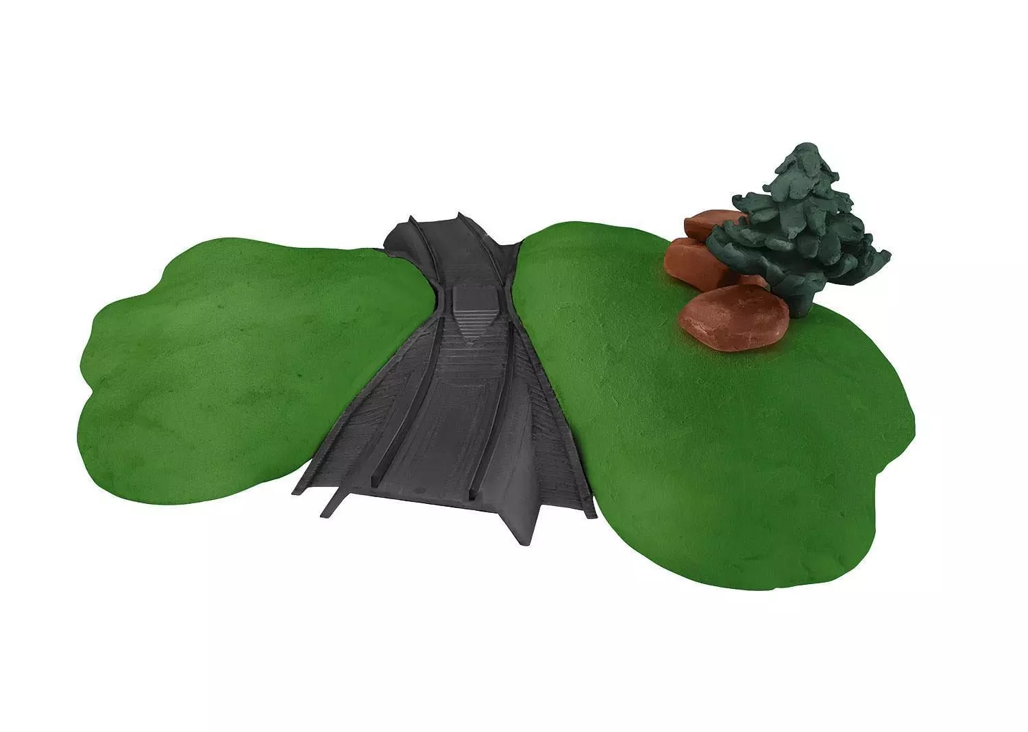 Spielerische Aufgleishilfe mit Landschaftselementen, zur harmonischen Eingliederung in die Eisenbahnwelt.