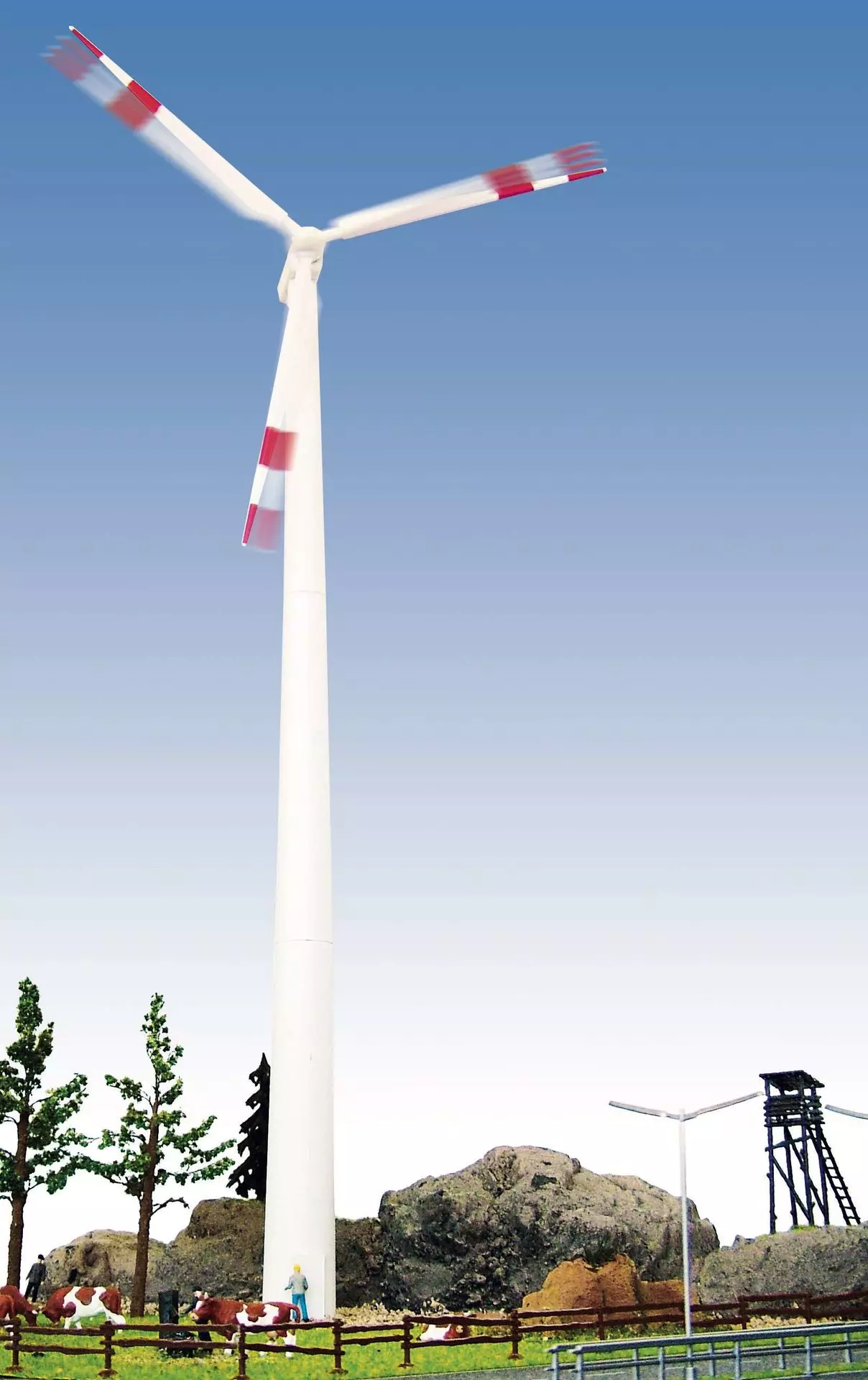 Klimaschutz auf der Modellbahn. Dieses Windrad verfügt über 3 rotierende Flügel und ein rotes Blinklicht. Wartungsfrei dank LED-Beleuchtung. Höhe: 58 cm, Fußdurchmesser: 3,7 cm.