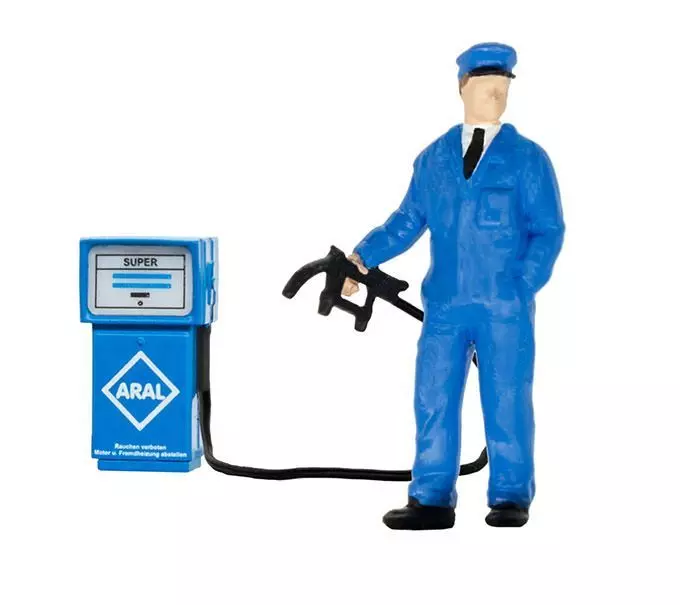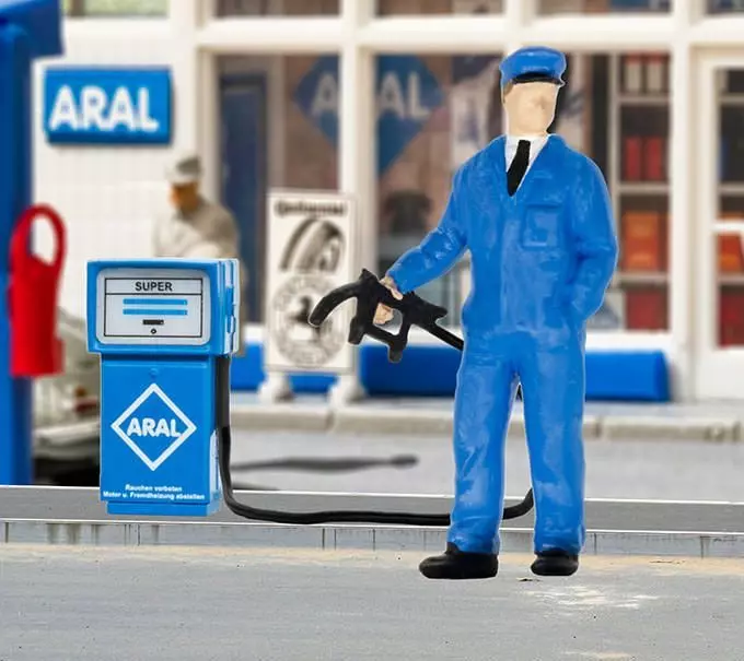Diese Figur dreht sich zur Seite. Mit Unterflurantrieb. Einbautiefe: 42 mm. Passt perfekt zum kibri Art. 38547, Moderne ARAL Tankstelle.
